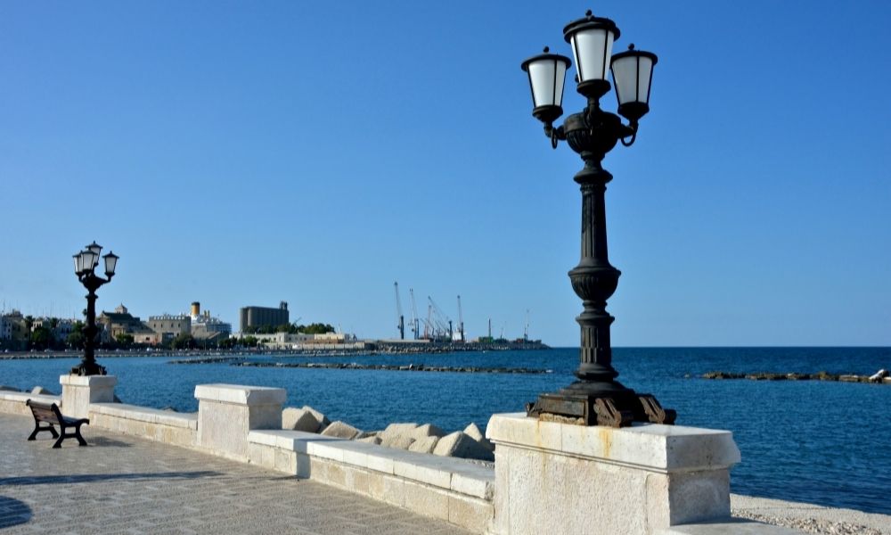 Questa passeggiata sul mare emozionante come poche. I lampioni, simbolo della città, rendono tutto più romantico. Le panchine sono tutte messe di fronte al mare e da qui si possono vedere i pescatori che lavorano il pesce e bevono birre fresche. Specialmente in estate ai baresi piace portare sul lungomare delle sedie in legno dove sedersi e chiacchierare con i propri amici accompagnati dal rumore delle onde.