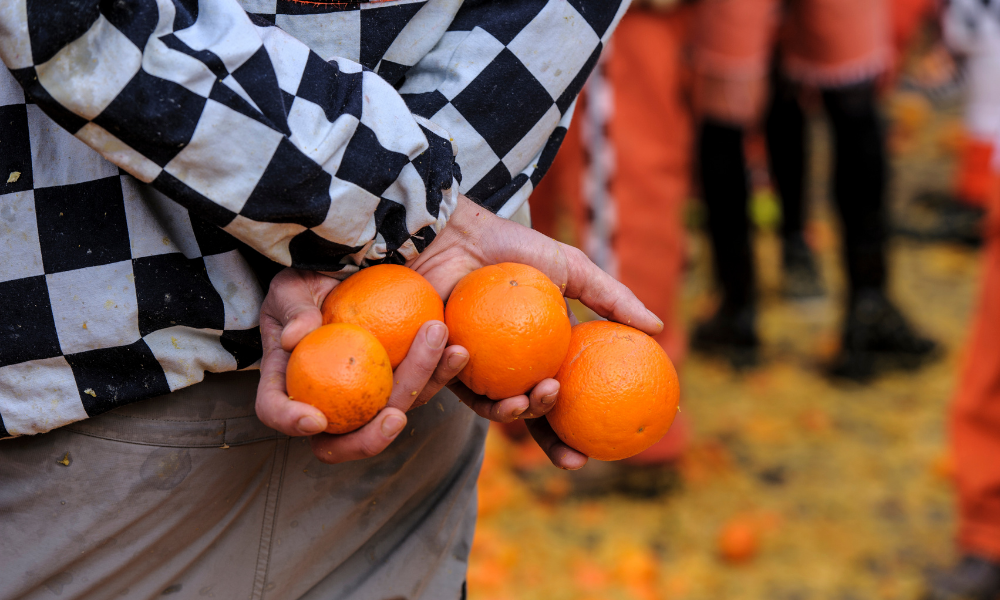 Ivrea a Carnevale fa rima con battaglia di arance. La grande festa del Carnevale 2024 a Ivrea è festeggiata a colpi di lanci di arance. La lotta delle arance di Ivrea è una rievocazione storica di una rivolta popolare che si svolse nel Medioevo. La storia di questa rivolta popolare è molto conosciuta in città e vale la pena di essere raccontata. Si narra che Violetta era una bellissima ragazza figlia di un mugnaio. Era solita andare in giro con un cappello rosso, molto lungo che le cadeva su una spalla. Violetta era stata promessa in sposa a un ricco signore, ma lei per ribellarsi lo fece ubriacare e lo uccise. Dopo questo gesto di protesta è scesa in piazza e ha sollevato una rivolta contro i ricchi del paese iniziando a lanciare arance!