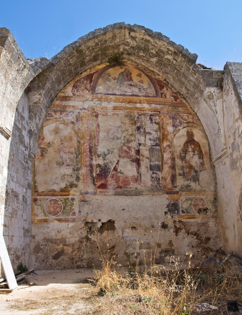 La cripta è modellata nella roccia, secondo il canone della “architettura in negativo” è composta da tre navate e tre altari. Qui si possono ammirare veri tesori d’arte sacra bizantina, come gli affreschi della Mater Domini e di Santa Ciriaca (Santa Domenica in greco).