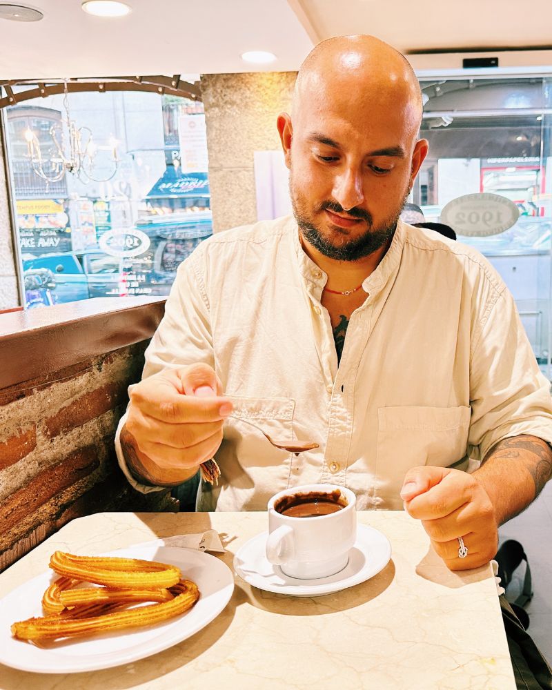 - Costo: porzione di cioccolata calda con 6 churros 5,90€; fetta di torta da 2,60€, caffè da 2€