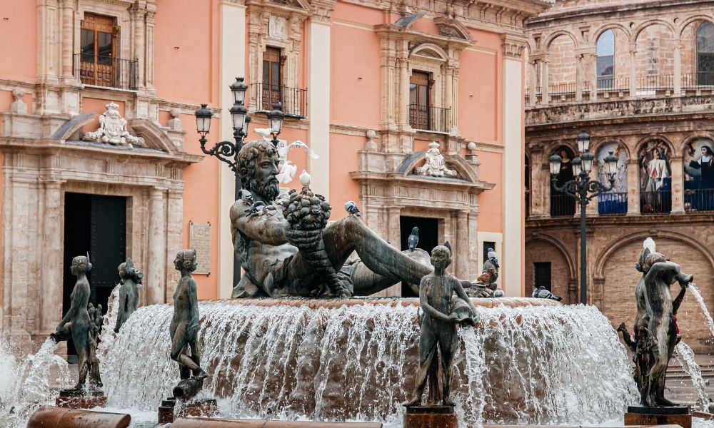 Appena uscito dalla Cattedrale troverai davanti a te una bella fontana dedicata al fiume di Valencia: il Turia. Questo è uno dei simboli della città e un luogo che non può mancare quando si visita Valencia. La fontana è riccamente decorata e la grande statua posta al centro simboleggia il fiume Turia con in mano una cornucopia o corno di Amaltea, simbolo dell’abbondanza. Tutto intorno poi ci sono 8 statue con delle anfore a simboleggiare gli 8 canali che ricevono l’acqua dal fiume Turia e che permettono all’agricoltura della zona di essere rigogliosa e sempre ricca. La fontana, inaugurata nel 1976, venne realizzata dallo scultore valenciano Manuel Silvestre Montesinos.