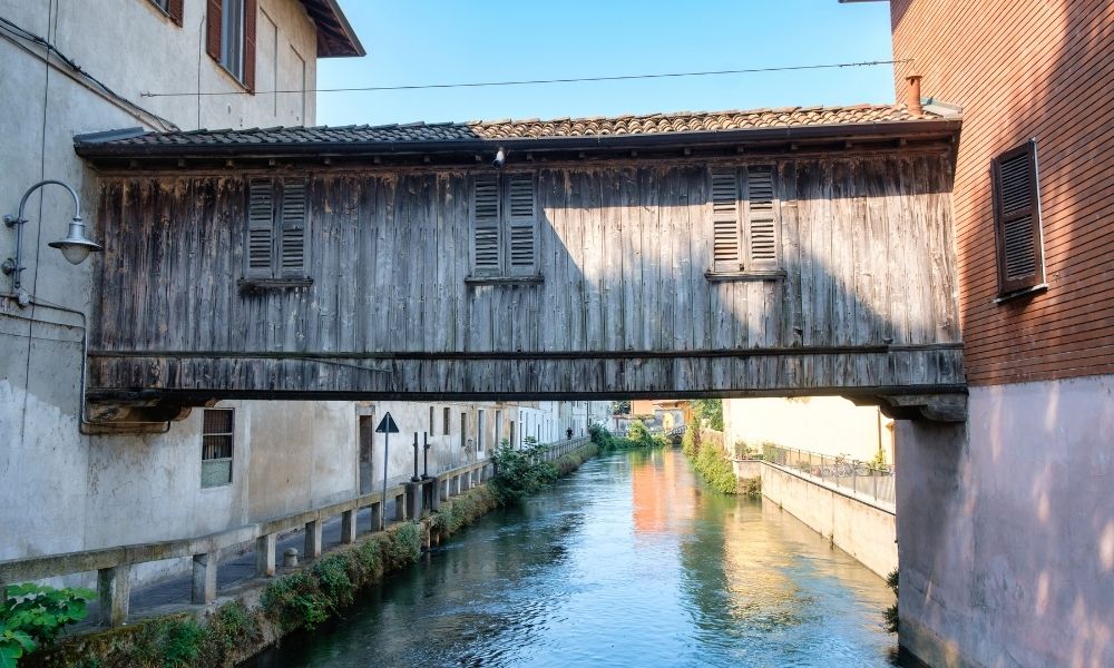 Il canale Martesana attraversa il paese di Gorgonzola. Questo è lo scorcio più suggestivo di tutta la ciclabile. Qui sono ancora visibili gli approdi delle imbarcazioni che percorrevano il naviglio, i lavatoi e una casa-ponte in legno. Se decidi di percorre la ciclabile a Settembre assicurati di arrivare in tempo in città per la famosa Sagra del Gorgonzola!