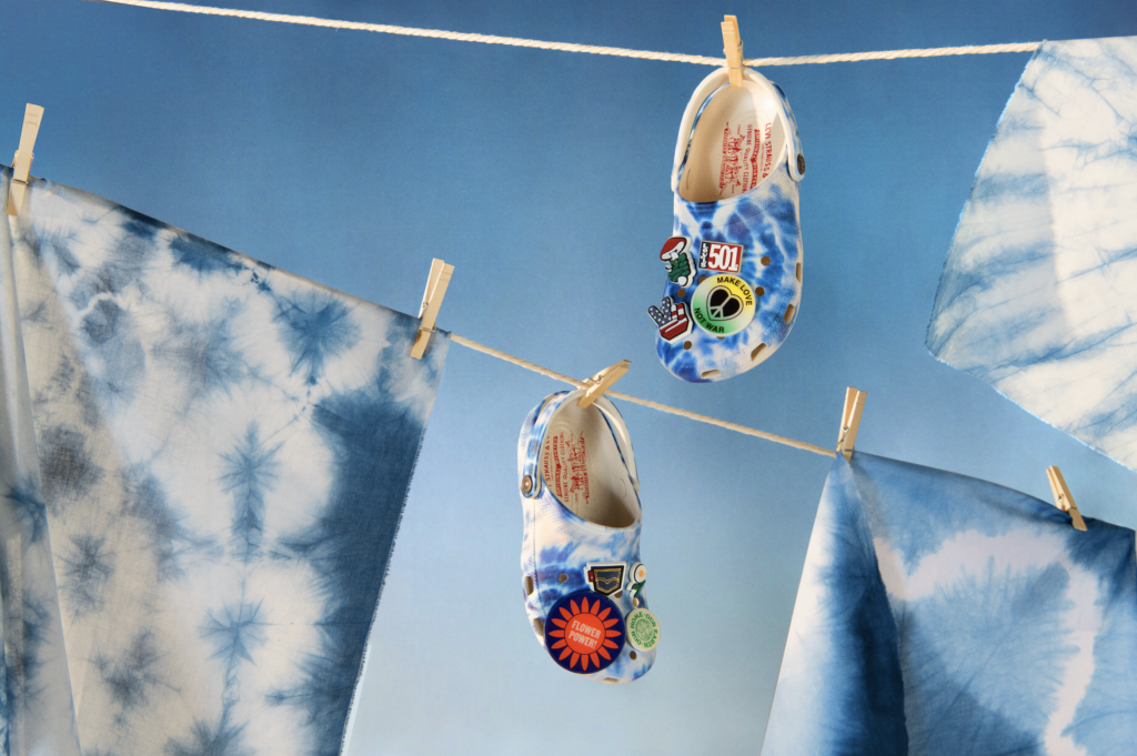 Inoltre Levi’s x Crocs ha anche un terzo modello, forse il più iconico, il Classic Clog con stampa tie-dye ispirata alla tecnica giapponese della tintura Shibori, contraddistinto per i bottoni Levi’s, la tab rossa e la stampa Two Horse-Pull sul plantare. La Classic Clog è stata personalizzata con otto ciondoli Levi’s JibbitzTM ispirati alla controcultura degli anni ’60 e alle grafiche Levi’s® d’archivio.
