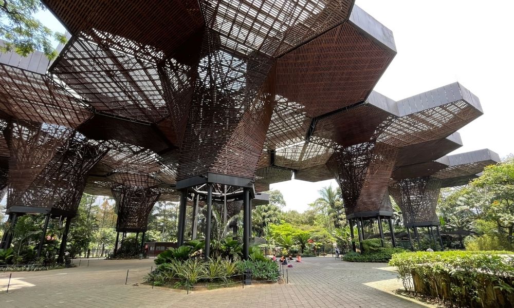 La struttura a rete di legno (questa della foto) è uno dei simboli del giardino, è alta circa 20 metri ed è chiamata Orquideorama serve a raccogliere l’acqua piovana e a proteggere le orchidee e le farfalle che trovano riparo sotto.