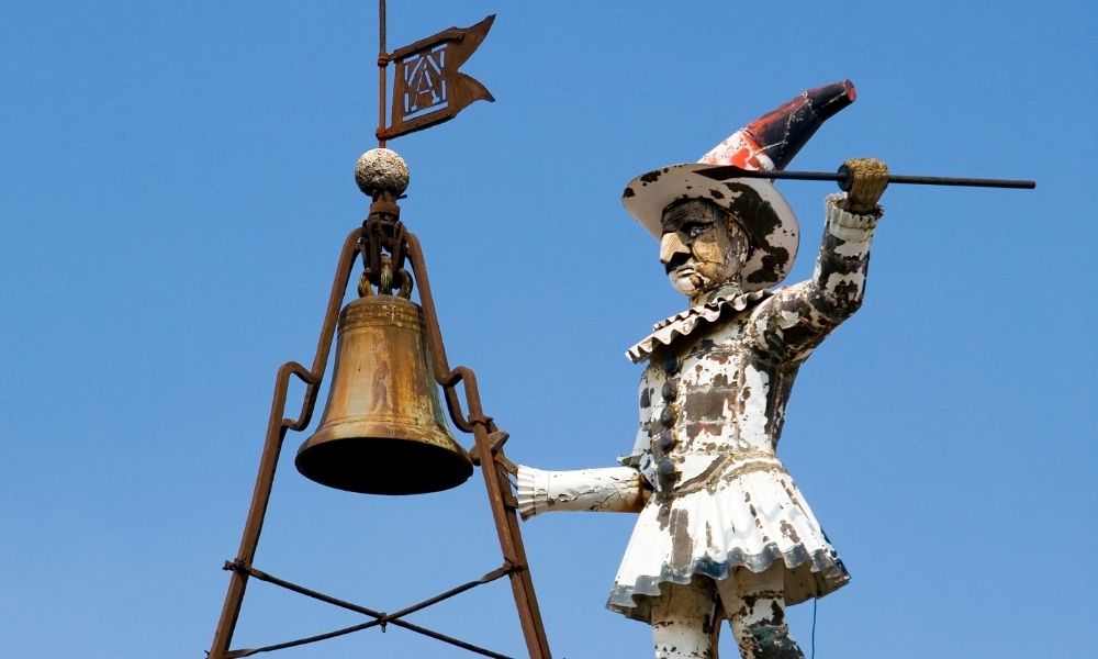 Sul motivo per cui si trovi Pulcinella a Montepulciano ci sono tante storie, ma la più accreditata è quella che ci riporta indietro nel tempo, al 1300. A quei tempo un campanaro si occupava di far suonare l’orologio, ma il suo lavoro faceva perdere davvero molti soldi al punto che fu rinominato “Mangia”, da “Mangiaguadagni”. Viste le somme di denaro spese, si decise di aggiungere un meccanismo automatico per far suonare le campane attorno al 1350. Nel 1500 arrivo nella chiesa un Vescovo napoletano che fece aggiungere una statua ispirata a “Mangia” sulla Torre dell’orologio e il meccanismo permetteva alla statua di scandire le ore, ma fu a fine del 1600 che dopo un restauro, “Mangia” divenne “Pulcinella”, per via delle richieste di un benefattore Napoletano che viveva a Montepulciano. Da quel giorno le ore nel borgo vengono scandite da Pulcinella in persona sempre allegro e felice di tirare martellate alla campana.