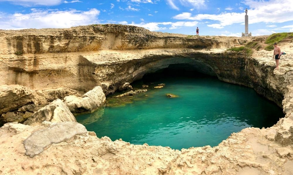 La Grotta della Poesia, non troppo distante da Otranto, è una piscina naturale tra le più famose del Salento ed è famosa perché qui storicamente si viene per fare il bagno e tuffi in questo foro scavato nella roccia. Inoltre la Grotta della Poesia è un luogo davvero speciale perché si trova proprio all’interno di un parco archeologico antichissimo dove è possibile scoprire la storia dell’antico popolo dei messapi che viveva in questa zona della Puglie. Essendo un parco archeologico, si paga un biglietto d’ingresso e per quanto ci sia un divieto di balneazione, moltissime persone fanno il bagno tutta l’estate o vengono qui anche solo per passeggiare durante la giornata. La Grotta della Poesia è un luogo davvero molto fragile, quindi se deciderai di vederlo, fai in modo da non lasciare traccia, non piantare ombrelloni e non introdurre nel parco il cibo. Inoltre, visto che è uno dei posti più visitati di tutto il Salento, abbiamo realizzato una guida per pianificare al meglio la tua visita alla Grotta della poesia.